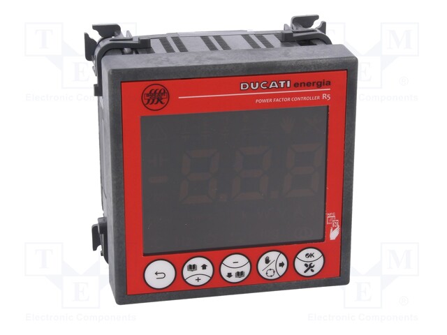 Bộ điều khiển hệ số công suất tự động 5 cấp cho mạng một pha và ba pha, kích thước 96×96, màn hình LED lớn màu đỏ, giao tiếp NFC tiêu chuẩn (để cấu hình và đọc từ App DUCATI Smart Energy), cổng RS485 (giao thức Modbus-RTU), Radio Giao diện SRD 868 MHz (để cấu hình và giám sát với bộ dữ liệu-cổng kết nối năng lượng DUCATI Energy Bridge), cảnh báo có thể định cấu hình và bảo vệ bước, cảm biến nhiệt độ bên trong tủ, tự động nhận dạng loại kết nối.