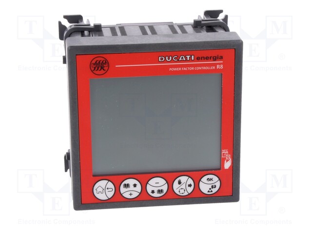 Bộ điều khiển hệ số công suất tự động cho mạng LV và MV một pha và ba pha, nguồn cung cấp điện phạm vi rộng có cách ly, có sẵn lên đến 11 bước, màn hình LCD lớn có đèn nền.Màn hình 128x128pixel, kích thước 96×96 giúp giảm độ sâu trong tủ điện ngay cả đối với các thiết bị được trang bị các tùy chọn thêm. NFC (tiêu chuẩn) và Bluetooth để cấu hình thuận tiện từ Ứng dụng năng lượng thông minh DUCATI), cổng RS485 (giao thức Modbus-RTU), sóng vô tuyến SRD 868 MHz (dành cho cấu hình / giám sát không dây và từ xa với cổng dữ liệu DUCATI Energy Bridge), RTC nội bộ với quản lý dải thời gian, bộ nhớ trong để ghi lại sự kiện (cảnh báo, thay đổi trạng thái pin, sửa đổi thông số) và ghi lại phép đo, cổng USB để tải xuống tệp sự kiện, cổng Ethernet để giám sát từ mạng LAN (giao thức Modbus-TCP và Webserver tích hợp), đo lường và hiển thị hài của dòng điện và điện áp lên đến bậc thứ 60, hiển thị thông báo bằng 8 ngôn ngữ, tự động nhận dạng loại kết nối.